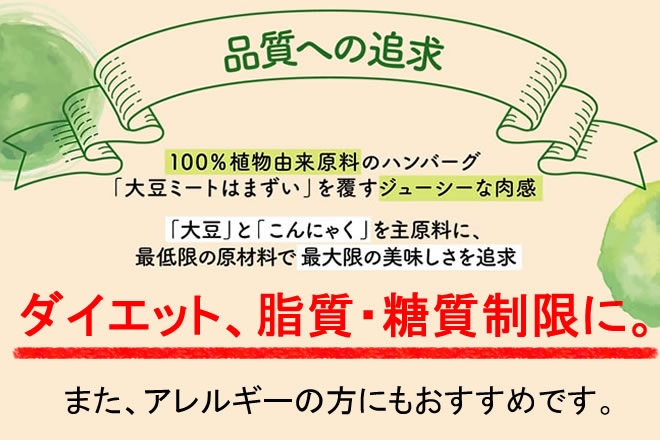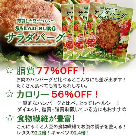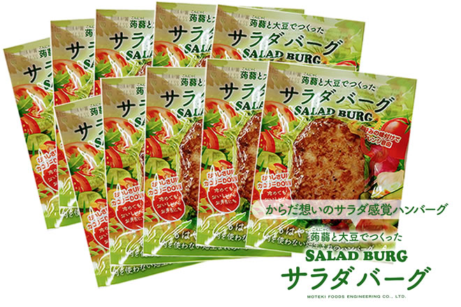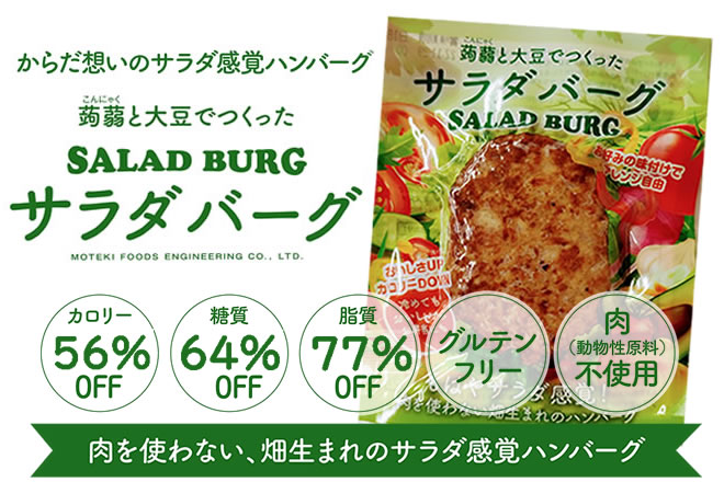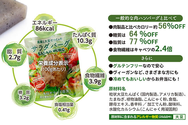 からだ想いのサラダ感覚ハンバーグ 大豆と蒟蒻でつくったSALAD BURG サラダバーグの原料でもある大豆は「畑のお肉」と呼ばれるほどタンパク質が豊富? つまり肉と同じようにサラダバーグは からだを作る栄養素がちゃんと含まれています。 さらに! 肉を使わずこんにゃくと大豆で出来ているから 一般的なハンバーグと比較すると・・・ ★カロリー 56%OFF❗ ★糖質   64%OFF❗ ★脂質   77%OFF❗ ※日本食品標準成分表2020年版(八訂)と比較 さらに! ★アレルギー物質(特定原料7品目)不使用! ダイエットはもちろん! 糖質、脂質制限している方にも? 冷めても美味しいのでお弁当にもオススメ! 〇内容量:90g×10個 〇原材料:粒状大豆たんぱく(国内製造、アメリカ製造)、たまねぎ、植物油脂、こんにゃく粉、食塩、酵母エキス、香辛料/pH調整剤、水酸化カルシウム(こんにゃく用凝固剤) 〇賞味期限:製造より常温300日 〇殺菌方法:気密性容器に密封し、加圧加熱殺菌 〇保存方法:直射日光を避け、常温で保存してください。 〇原料に含まれるアレルギー物質(28品目中):大豆 〇備考:開封後は冷蔵庫で保存し、賞味期限に関わらずお早目にお召し上がりください。 〇お召し上がり方:あらかじめ加熱してありますので、そのままでもお召し上がれます。 温めるとより美味しくお召し上がりいただけます。 ・鍋などで袋のまま湯煎する ・袋から出して電子レンジで温める ・フライパンで軽く焼く ・冷めても美味しいのでお弁当にもオススメ ※袋のまま電子レンジに入れないでください。 ※加熱の際は、やけどに十分お気を付けください。 〇栄養成分表示(100g当たり)  エネルギー 77kcal  たんぱく質 9.3g  脂質 2.4g  炭水化物 6.4g   ―糖質2.9g   ―食物繊維3.5g  食塩相当量 0.37g ※発送までの日数:ご注文から7日以内 ※配送方法:宅配便 ※営業日:10~17時(土日祝日休業)