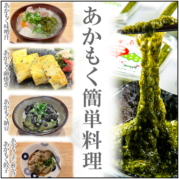 あかもくはネバネバでシャキシャキした食感と磯の良い香り、そしてクセの無い味がとっても食べやすい海藻なんです。 またいろんな料理と簡単に組み合わせることができるのも特徴です。 例えば、味噌汁や納豆などにあかもくを加えるだけで美味しさ倍増、それと同時に驚きの栄養価を摂取できる体にも嬉しい食品です。