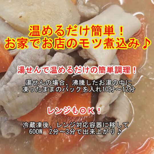 【8食】国産豚を使用☆特製だれで仕上げた「豚モツ煮込み」 ◎◎◎◎◎◎◎◎◎◎◎◎◎◎◎◎◎◎◎ 2セット同時購入で2食プレゼント! 1セットの場合→8食 2セットの場合→8食×2+2食 合計18食! ◎◎◎◎◎◎◎◎◎◎◎◎◎◎◎◎◎◎◎ ☆東京の居酒屋さん約10店舗で提供される人気の品‼ ☆湯煎、レンジ、温めるだけ簡単! ☆お家でお店のモツ煮込み♪ モツ独特の臭みを丁寧に下処理して取り除いています。 もつ煮には欠かせない人参とゴボウを加え、オリジナル味噌で調味。 隠し味にフォンドボーを加えました。 コク深い味わいが特徴です。 ★豚モツの臭みを除去し、野菜を加えて。 ★隠し味にフォンドボーを使った特製だれで仕上げた逸品。 ★温めるだけ!簡単調理!  湯せんで温めるだけの簡単調理!  湯せんの場合、沸騰したお湯の中に凍ったままのパックを入れ10分~12分!  レンジもOK!冷蔵解凍後容器に移していただき600W 2分~3分で出来上がり♪ ★おつまみにも!ご飯のお供にも!  ビールや酎ハイ。  お酒のおつまみにはもちろん。  もつ煮定食、ご飯のおかずとしてもお楽しみください。 〇内容量:170g×8パック 〇原材料名:豚内臓肉(国産)、人参、醤油、味噌、ごぼう、フォンドボー、砂糖、ニンニク、生姜、酒粕発酵調味料、玉葱、ごま、醸造酢/調味料(アミノ酸等)、リン酸塩(Na)(一部に小麦・豚肉・大豆・牛肉・ごまを含む) 〇賞味期限:製造日より365日 〇保存方法:冷凍-18℃以下 〇加工地:日本 〇お召し上がり方: 湯せんの場合:沸騰したお湯の中に凍ったままのパックを入れ、10分~12分 レンジの場合:冷蔵解凍後容器に移していただき600W 2分~3分 〇栄養成分表示/100g当たり  エネルギー:209cal  たんぱく質:15.0g  脂質:11.5g  炭水化物:12.7g  食塩相当量:1.7g  ※計算値 ※発送までの日数:ご注文から7日以内 ※配送方法:クール冷凍便 ※営業日:10~17時(土日祝日休業)
