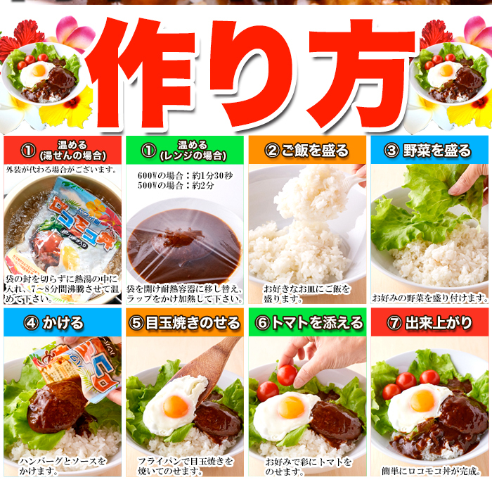 ライスに目玉焼きをのせ、お好みの生野菜を添え、温めたロコモコ丼の素をかけて出来上がりです。