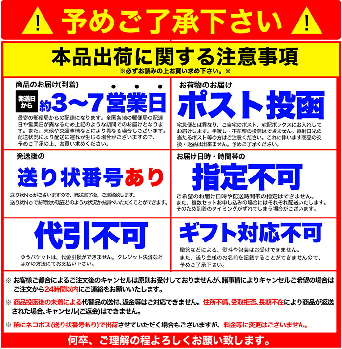 ・商品投函後の未着による代替品の送付、返金等はご対応できません。住所不備、受取拒否、長期不在により商品が返送された場合、キャンセル(返金)はできません。