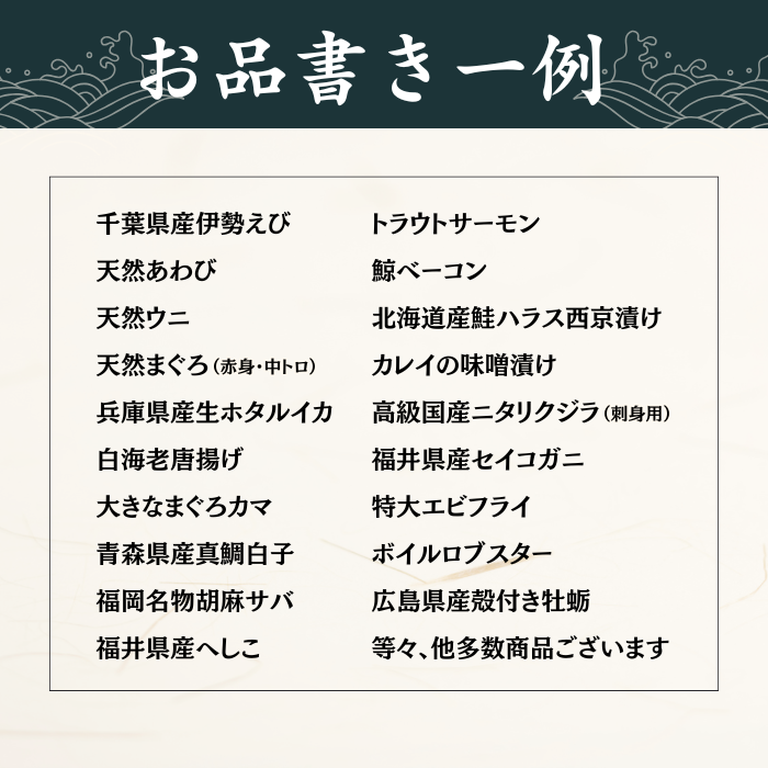 ●刺身用生うに・天然まぐろ・千葉県産伊勢えび・活アワビの中から1品必ず入ります。
