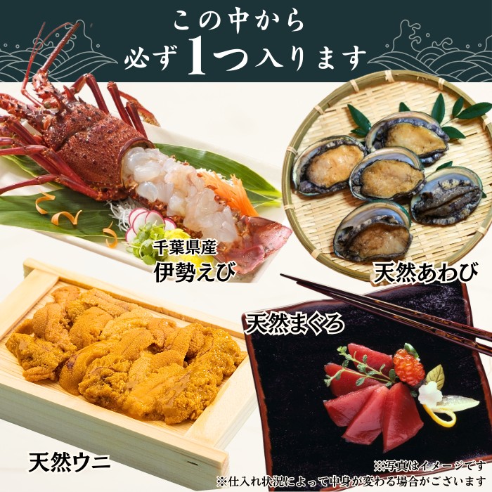 ●刺身用生うに・天然まぐろ・千葉県産伊勢えび・活アワビの中から2品必ず入ります。