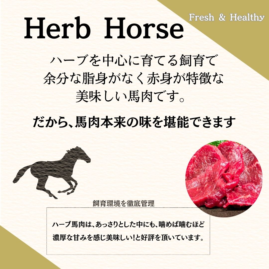 ●HERB HORSE:ハーブを中心に育てる飼育法で余分な脂身がない赤身が特徴な馬肉です。馬肉本来の味を堪能していただきたく、品質にこだわり飼育環境を徹底して管理して、皆様が美味しく味わっていただけるようこだわっています。