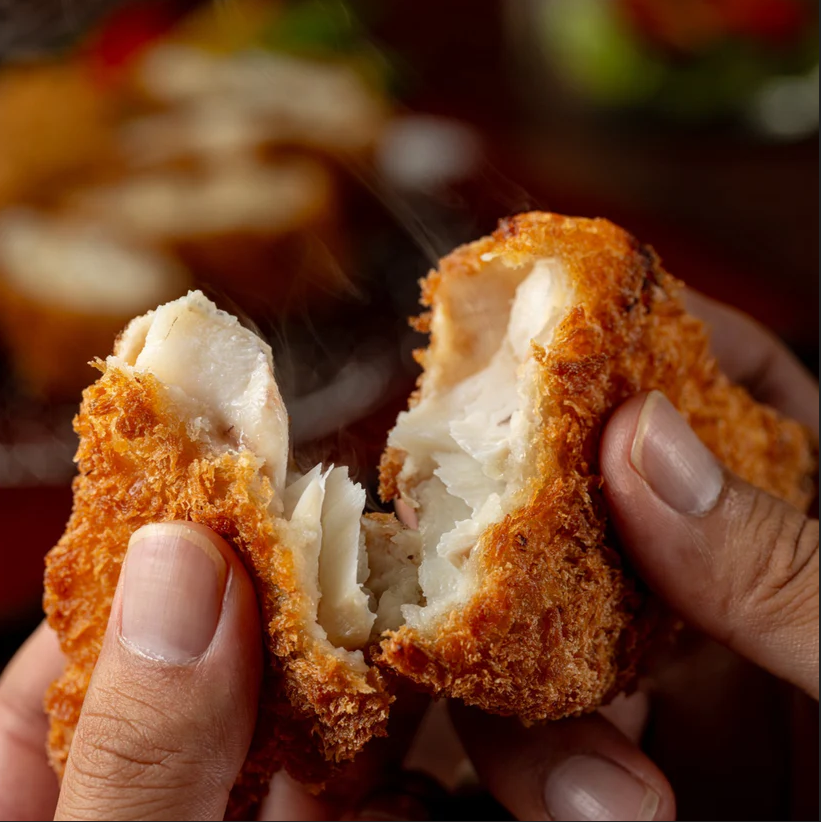 揚げたては、衣が**サクサク**!そして、一口食べると、中から新鮮な真鱈の旨みがジュワッとあふれ出します。この**ふっくら、ふわふわ**な食感は、冷凍とは思えないほど。