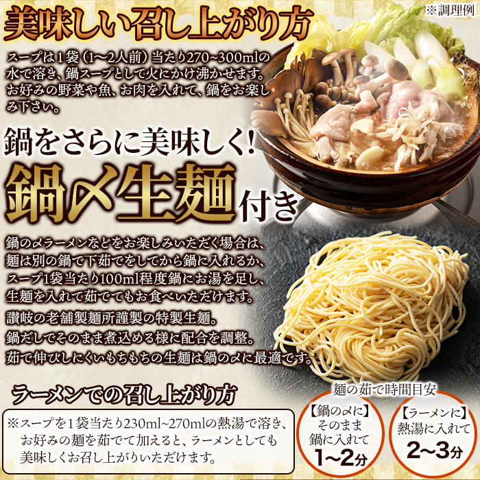3.鍋の締めラーメン等をお楽しみいただく場合は、麺は別の鍋で下茹でをしてから鍋に入れるか、スープ1袋当たり100ml程度鍋にお湯を足し、生麺を入れて茹でてもお食べいただけます。