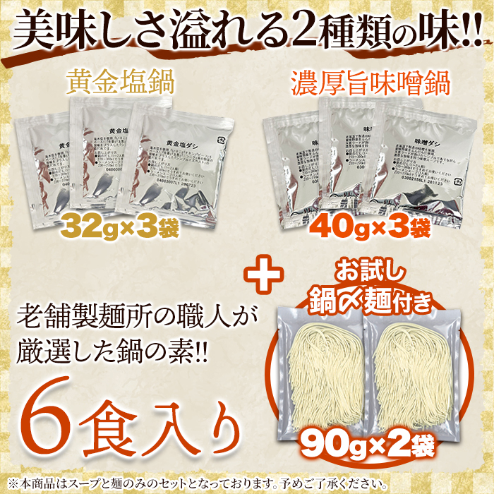 【ポスト投函】お試し〆麺付き!鍋の素(味噌スープ3袋+黄金塩スープ3袋+鍋〆麺2玉)
