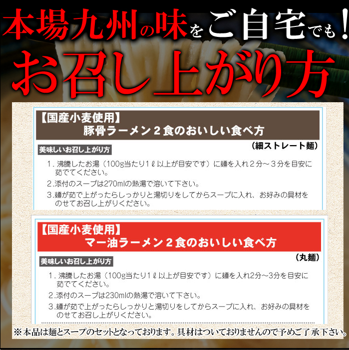 ●麺が茹で上がったらしっかりと湯切りをしてからスープに入れ、お好みの具材をのせてお召し上がりください。