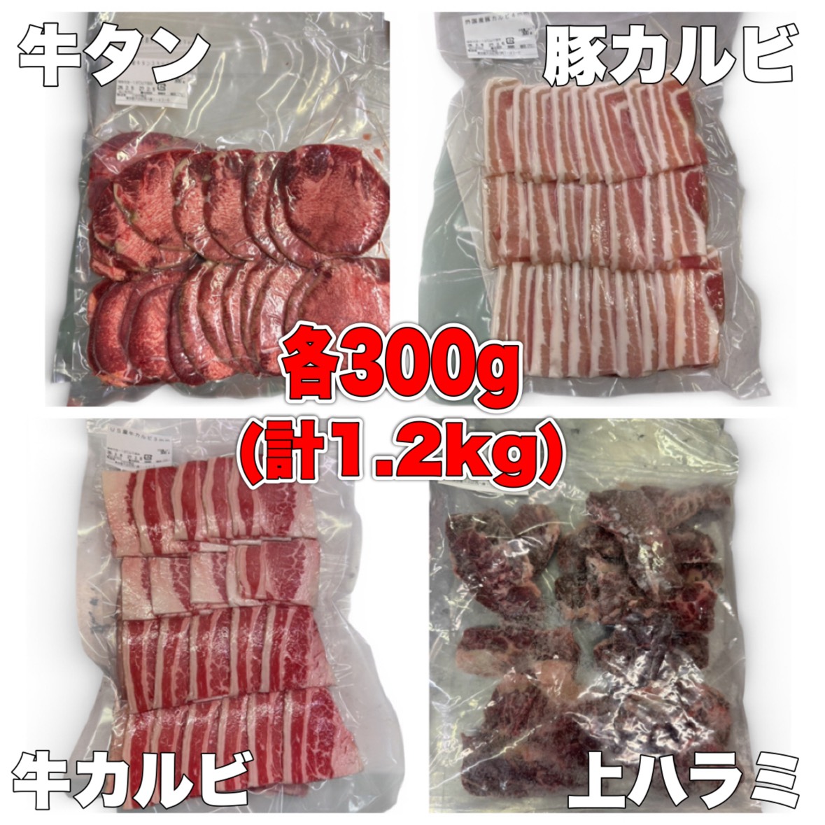 牛タン/上ハラミ/豚カルビ/牛カルビ 各300g(合計1.2kg)